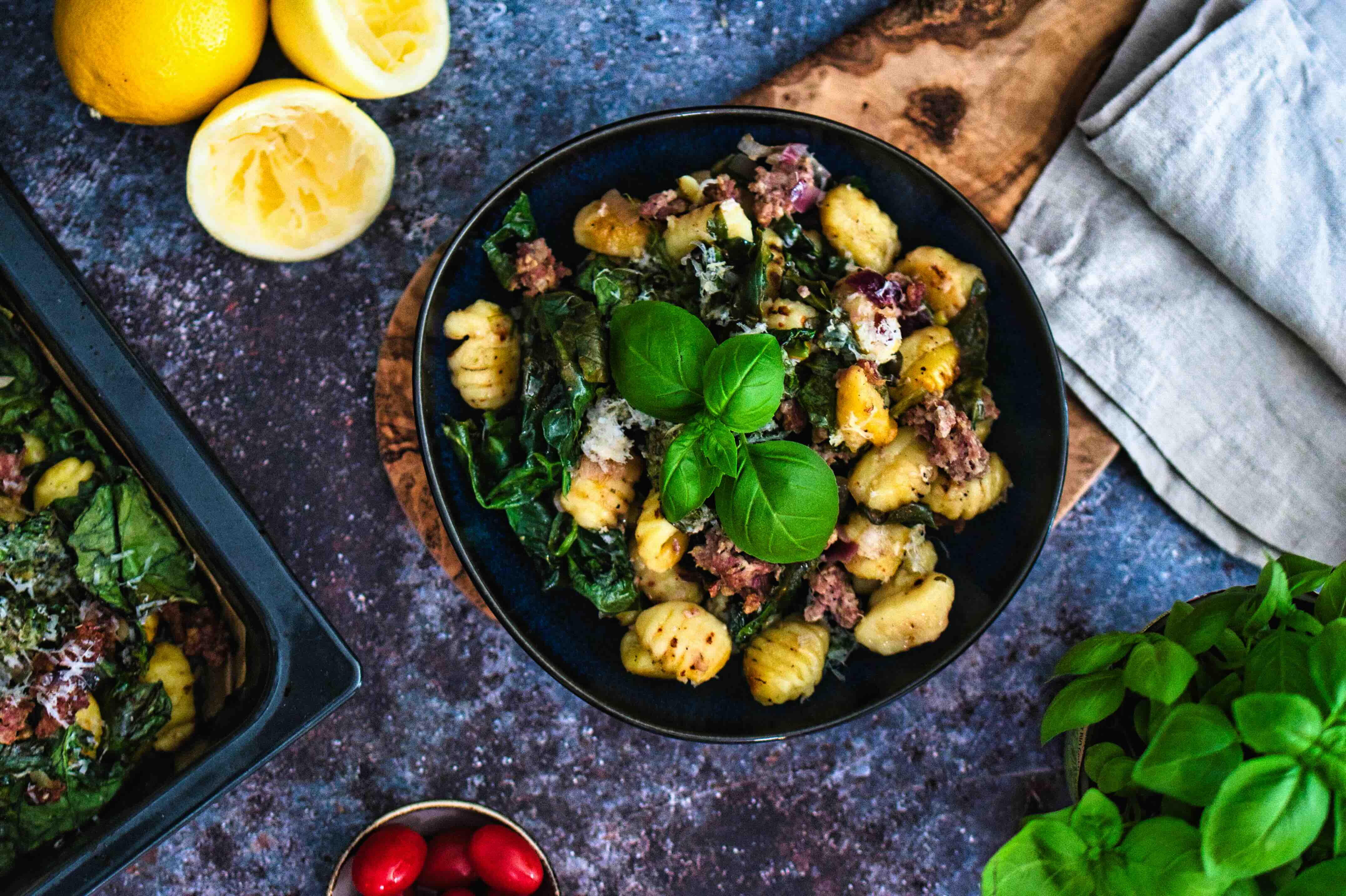 Alles kommt auf ein Blech, ab in den Ofen – und während dort Röstaromen entstehen, könnt Ihr abschalten, duschen oder schon mal die Beine hochlegen. Das Ergebnis: knusprige Gnocchi, würzige Proteinquelle, ordentlich Gemüse und ein frischer Zitronen-Kick. Einfach, alltagstauglich und trotzdem so gut, dass Ihr es garantiert öfter machen werdet.